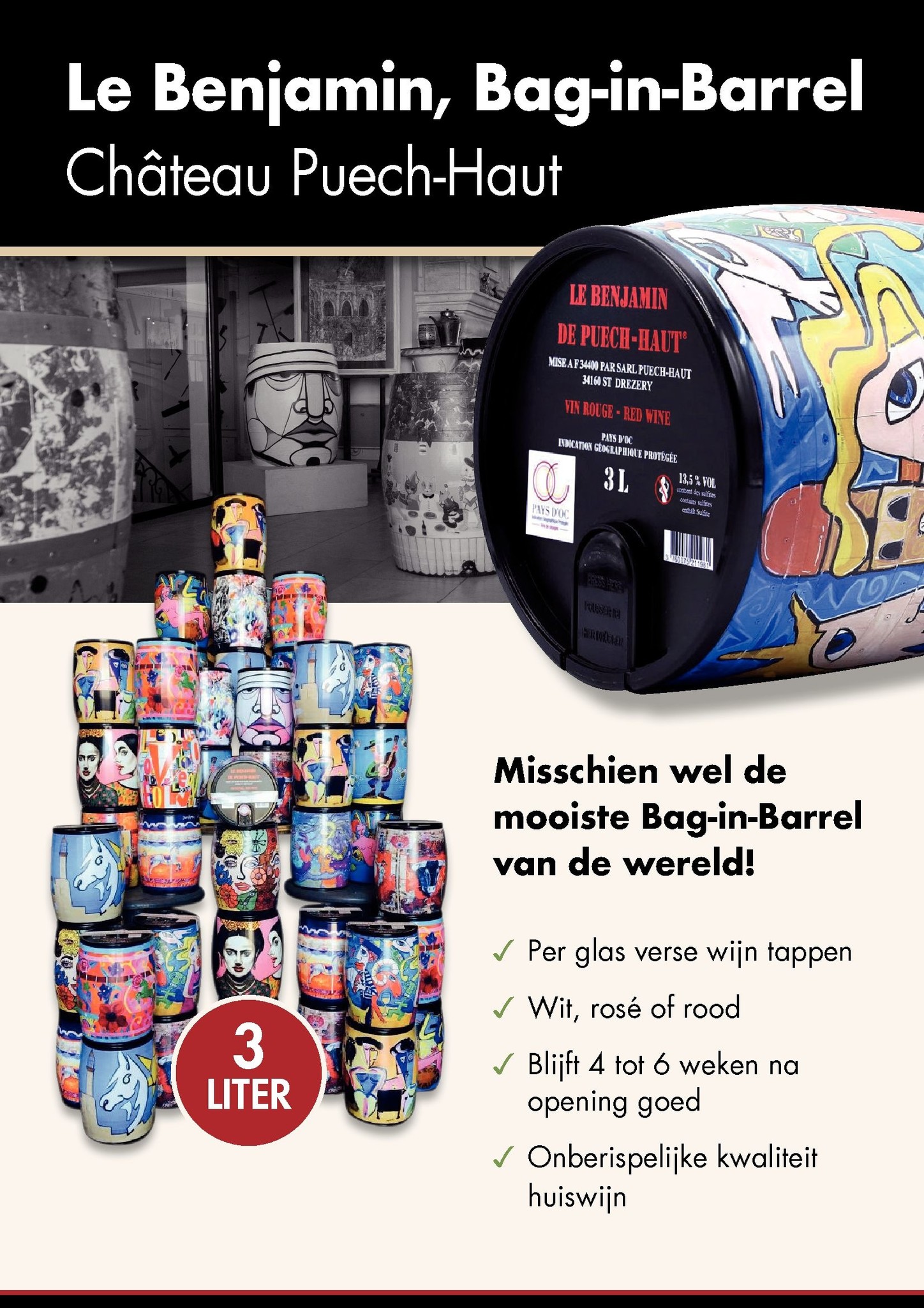 De Bag in Box, of liever gezegd, Bag in Barrel van Château Puech Haut is een echte blikvanger en een groot succes in Frankrijk. De afbeelding op de kleine vaten zijn een kopie van door kunstenaars beschilderde eikenhouten fusten. Zo brengt Puech Haut kunst en wijn bij elkaar. De voordelen van een 3 liter vacuümzak zijn voor steeds meer wijnliefhebbers doorslaggevend. Altijd per glas beschikbaar zonder dat de kwaliteit achteruitloopt want deze Benjamin is zeker 4 tot 6 weken houdbaar na opening. Omdat deze vaatjes heel gewild zijn vult Puech Haut zeer frequent af en is de versheid van de wijn gegarandeerd. De wijn is het best van smaak tot ongeveer 6 maanden na aankoop in onze winkel. De rosé Benjamin is gemaakt van direct geperste grenache druiven en smaakt lekker vol, iets kruidig en sappigdroog. Leg deze BIB-Art, zoals Puech Haut de kleine en opvallende vaten noemt, in de koeling en u heeft altijd een goed glas rosé wijn beschikbaar zonder een fles open te hoeven maken.